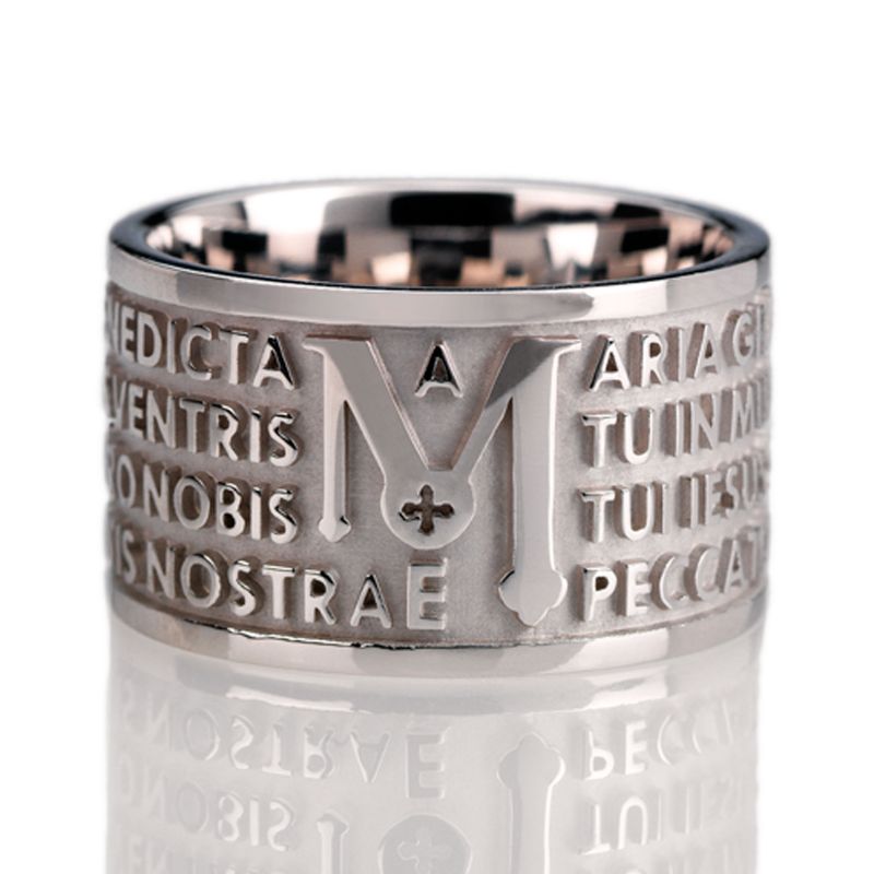 Gli anelli in argento rodiato della collezione «Animae» riproducono in rilievo la preghiera del Padre Nostro e dell’Ave Maria nella lingua Latina. L’argento rodiato lucidato esalta le tonalità del rodio a contrasto creando un effetto di straordinaria luminosità che avvolge l’anello e le parole impresse.