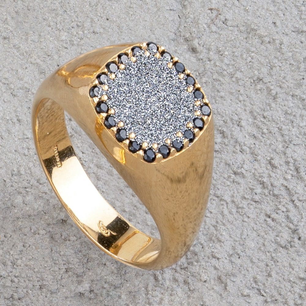 Anello Jolie modello bombato in argento placcato oro con quadrato rivestito di polvere di diamanti e cornice di pietre nere. Disponibile nelle finiture oro giallo e oro rosa.