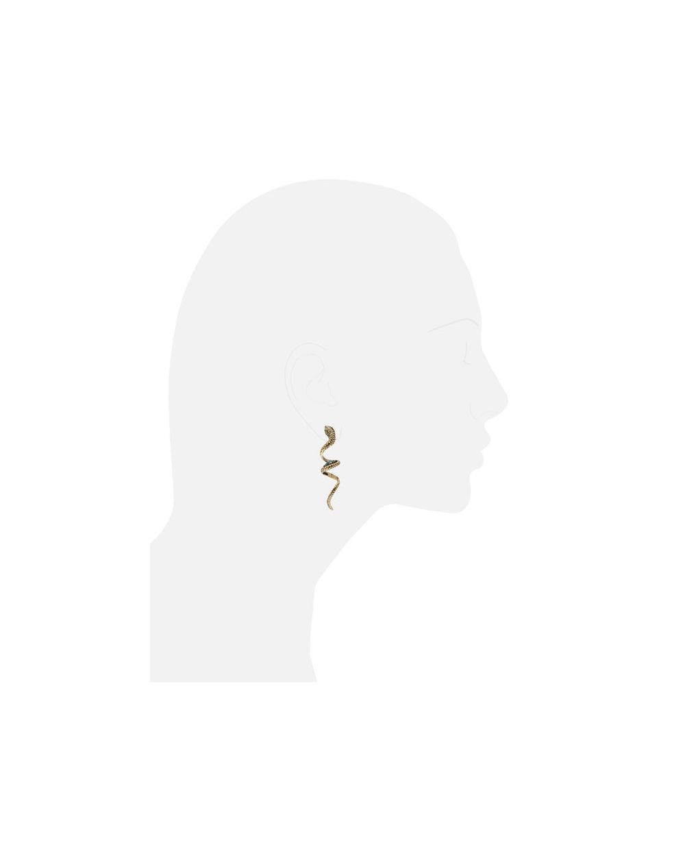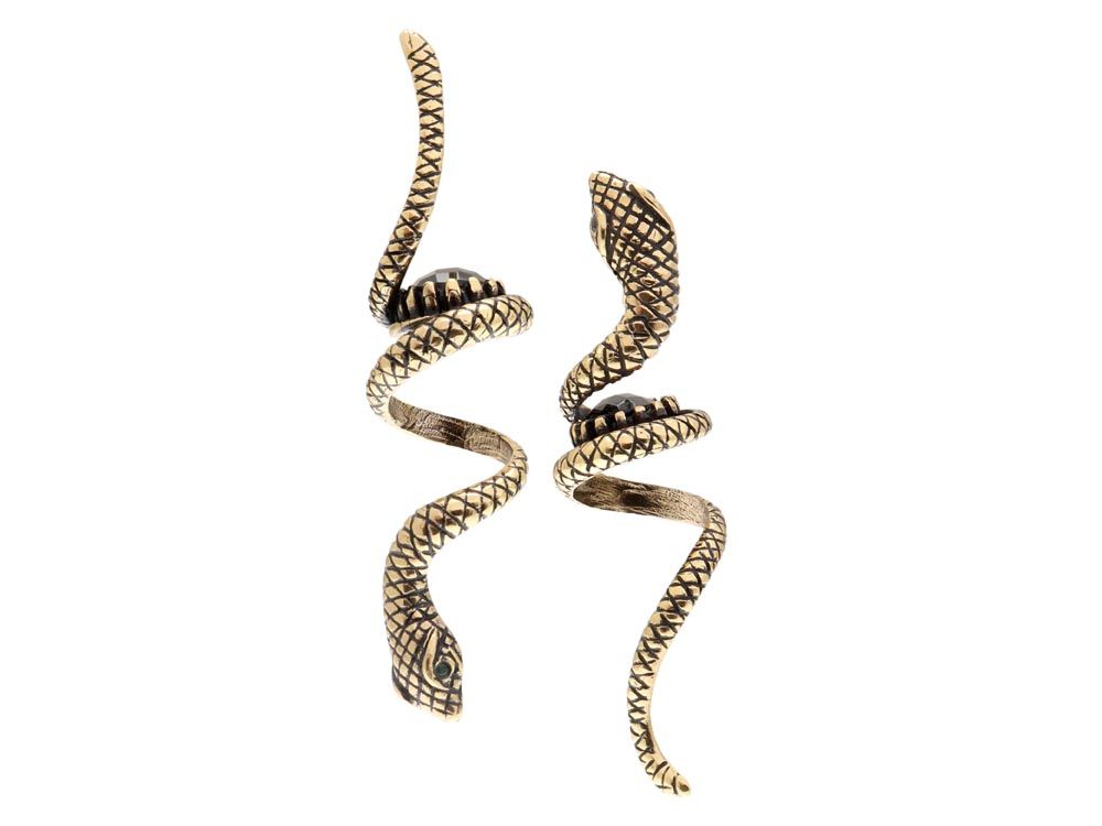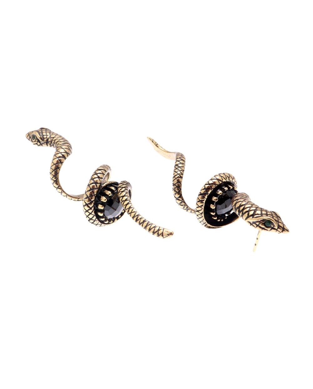 Orecchini in ottone dorato con perno a cui sono saldati due serpenti che circondano due spinelli. Bigiotteria in stile tradizionale da indossare in ogni occasione. – Dimensione H 7cm L 1.5cm.