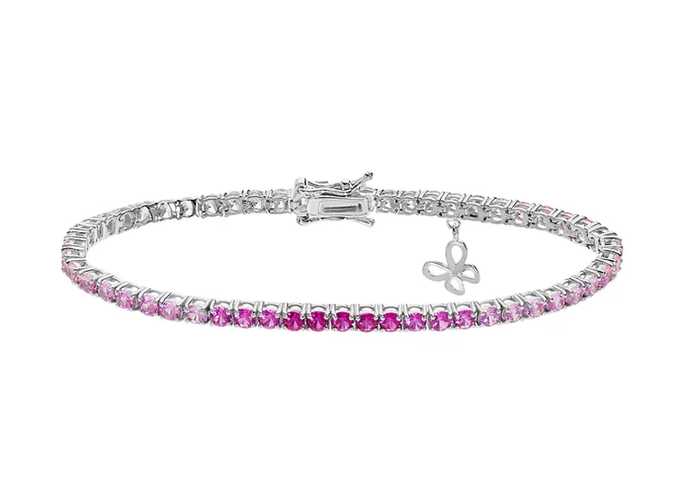 Bracciale Tennis della Collezione Farfalle in Argento 925‰, una fila ininterrotta di lucenti zirconi che sfumano nei toni del rosa acceso dai moduli centrali più scuri fino agli zirconi bianchi vicino la chiusura. Ritroviamo il charm farfalla come simbolo di rinascita e nuova vita, nonchè icona della Collezione. La chiusura è impreziosita da zirconi bianchi sul dorso vicino ai doppi otto di sicurezza. Gioielli perfetti come regalo per le tue testimoni in nuance con il colore del tuo Matrimonio. Talismani portafortuna dedicati al giorno del sì ma che ben si adattano ad ogni occasione.